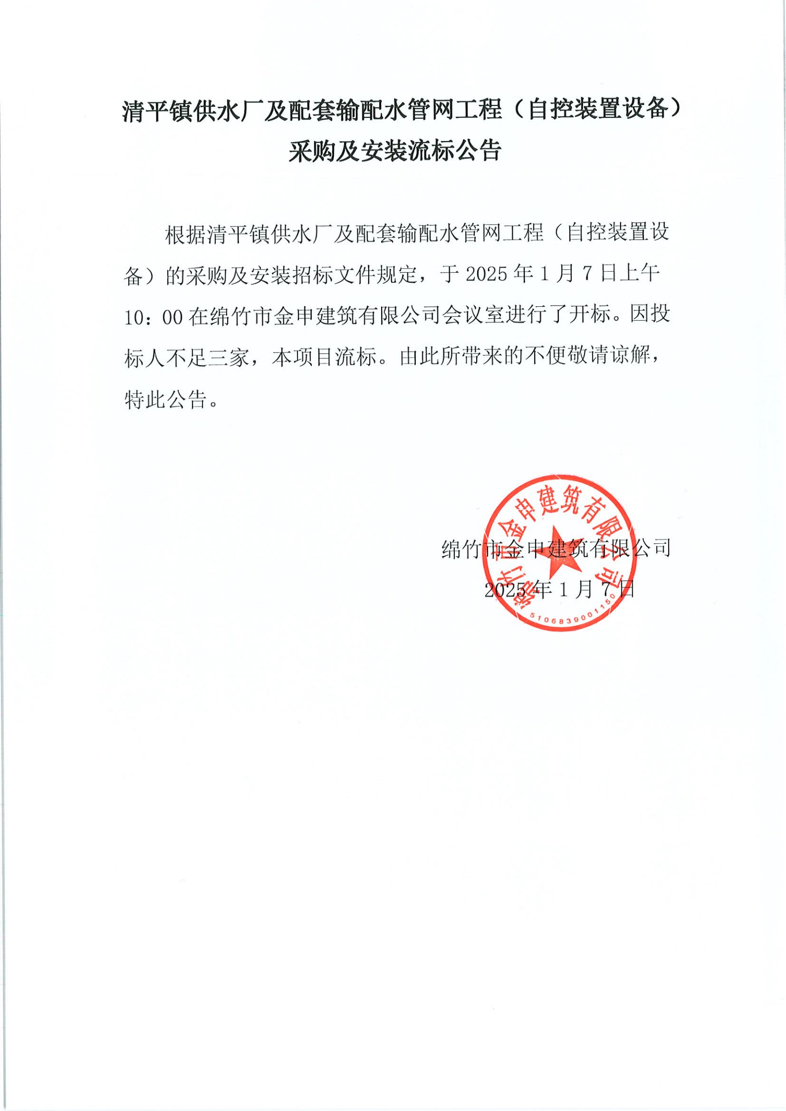 清平鎮(zhèn)供水廠及配套輸配水管網-自控裝置設備流標公告