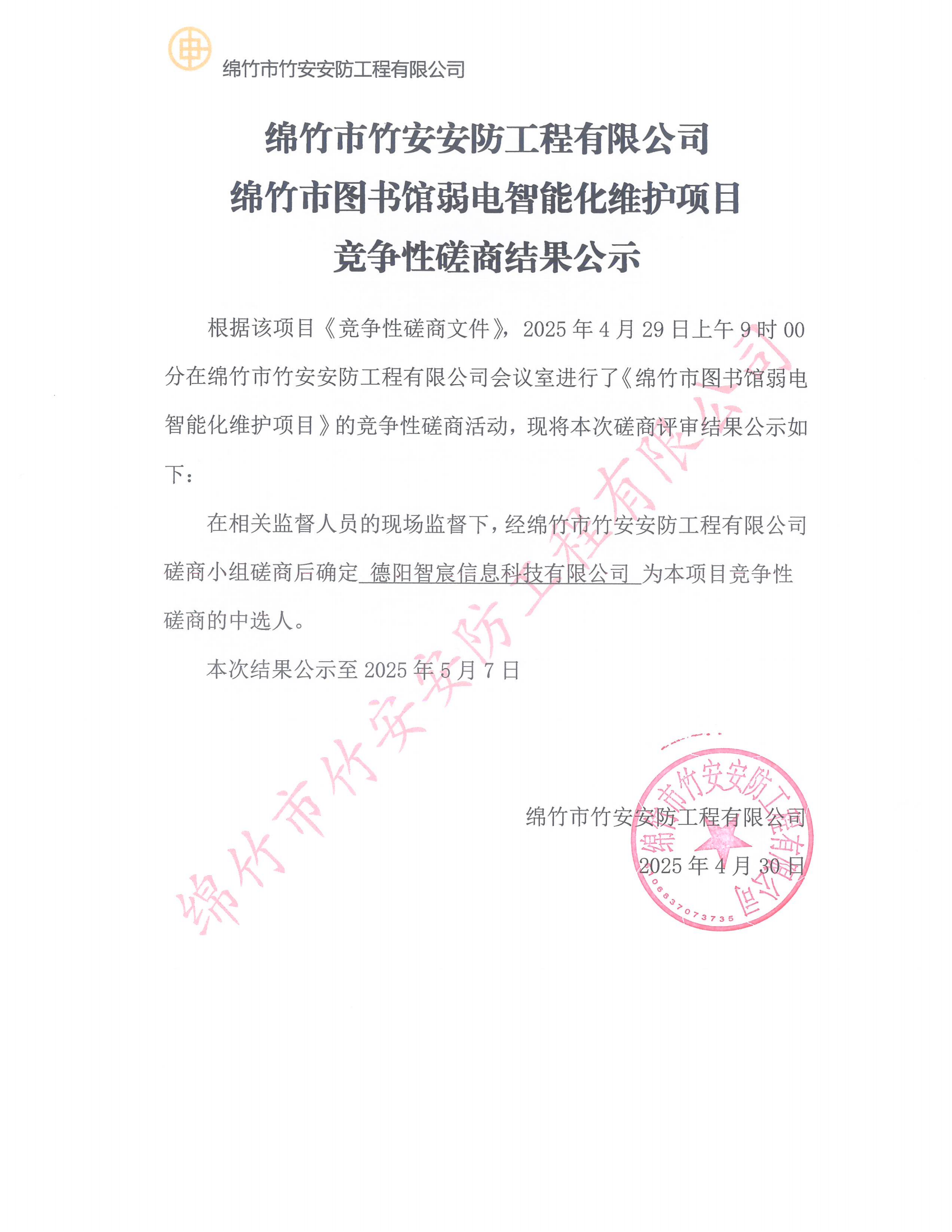 綿竹市圖書館弱電智能化維護(hù)項目競爭性磋商結(jié)果公示