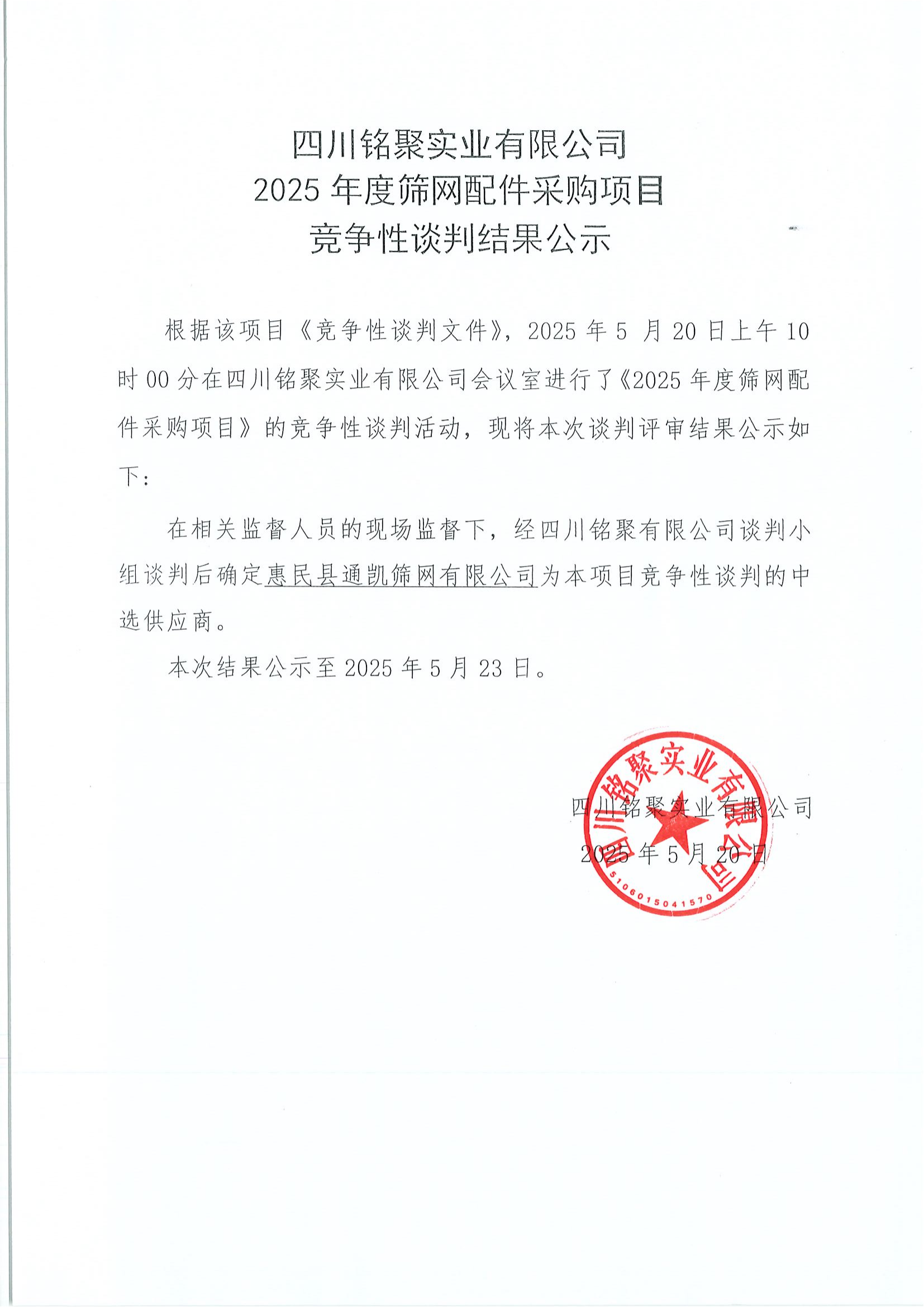 銘聚實(shí)業(yè)2025年度篩網(wǎng)配件采購(gòu)項(xiàng)目競(jìng)爭(zhēng)性談判結(jié)果公示