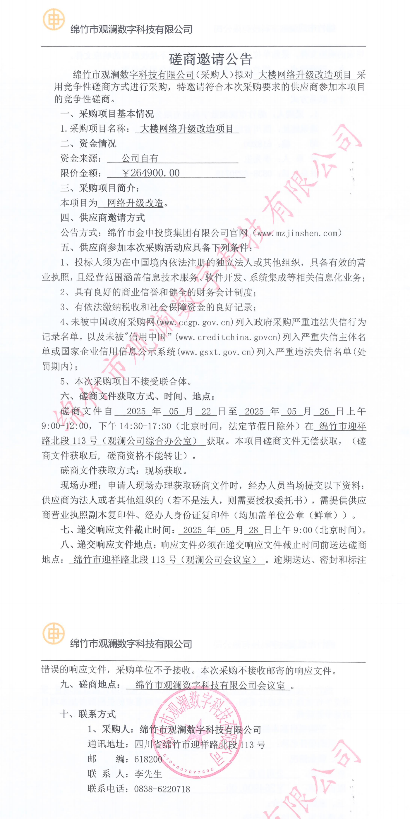 綿竹市觀瀾數(shù)字科技有限公司磋商邀請(qǐng)公告