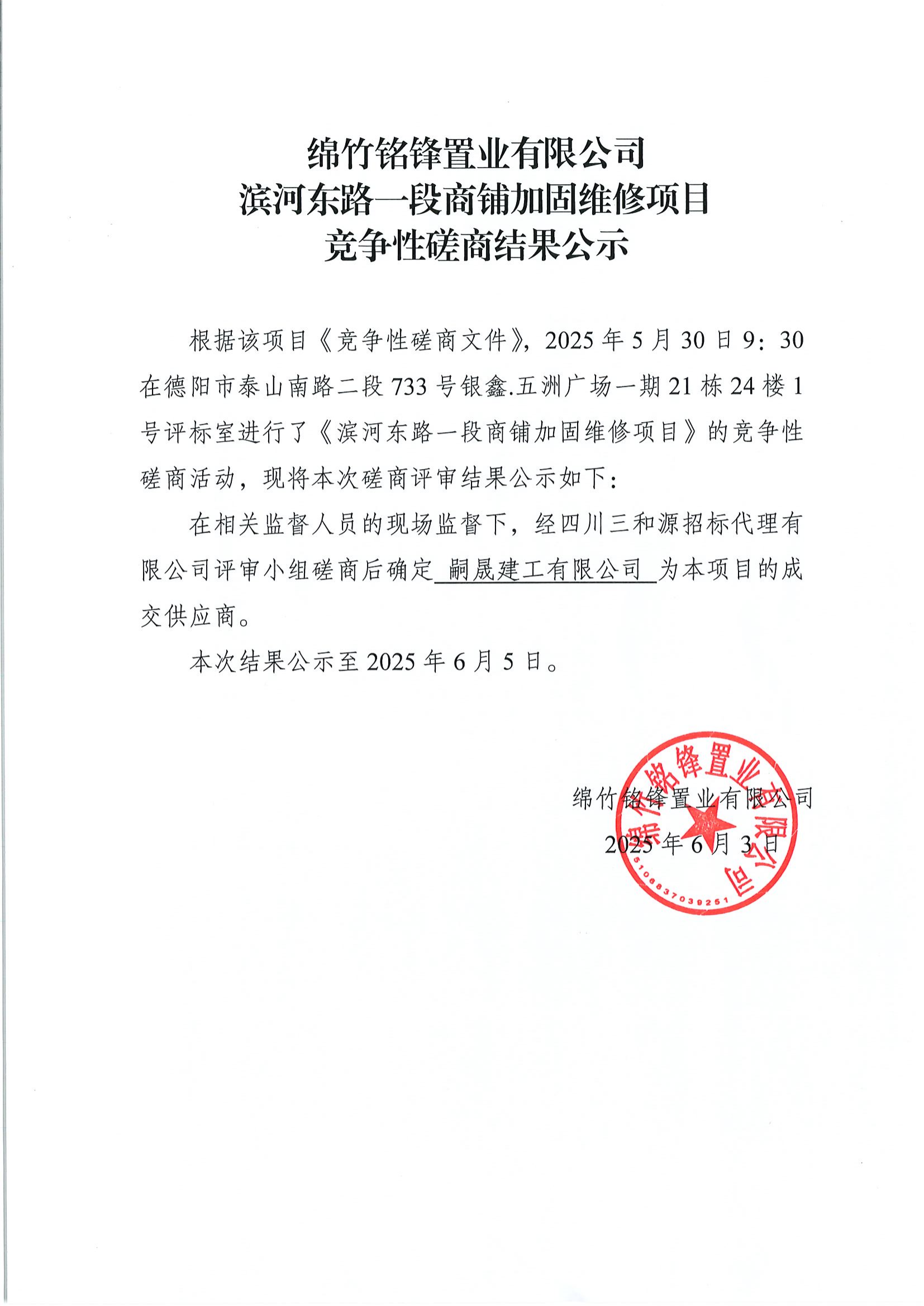 濱河?xùn)|路一段商鋪加固維修項(xiàng)目競(jìng)爭(zhēng)性磋商結(jié)果公示