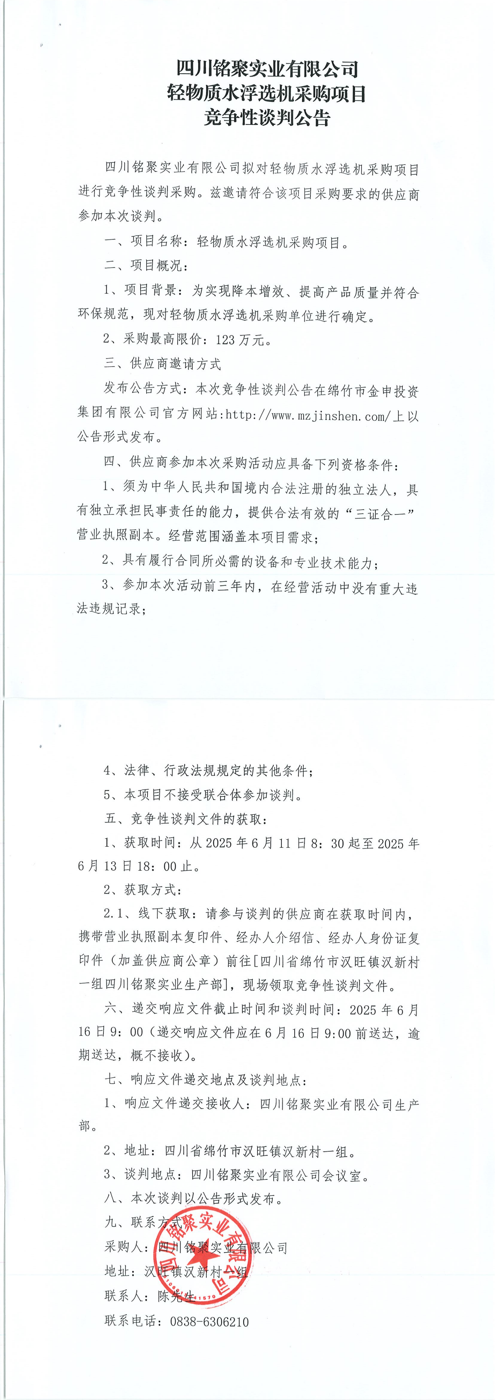 銘聚實(shí)業(yè)輕物質(zhì)水浮選機(jī)采購(gòu)項(xiàng)目競(jìng)爭(zhēng)性談判公告