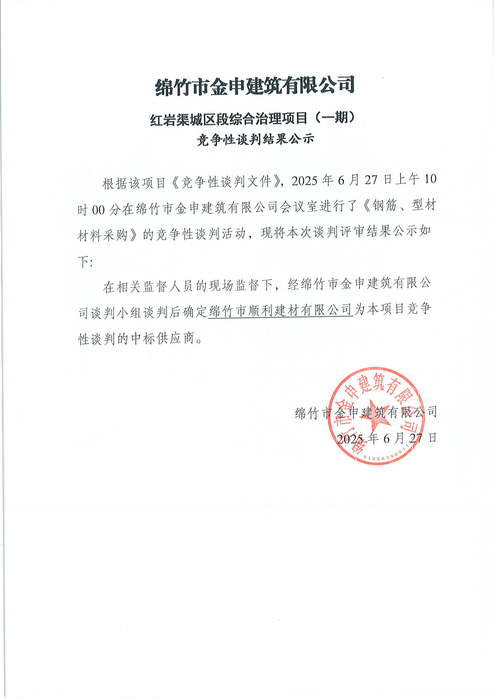 綿竹市紅巖渠項目(鋼筋、型材)材料采購中標結(jié)果公示