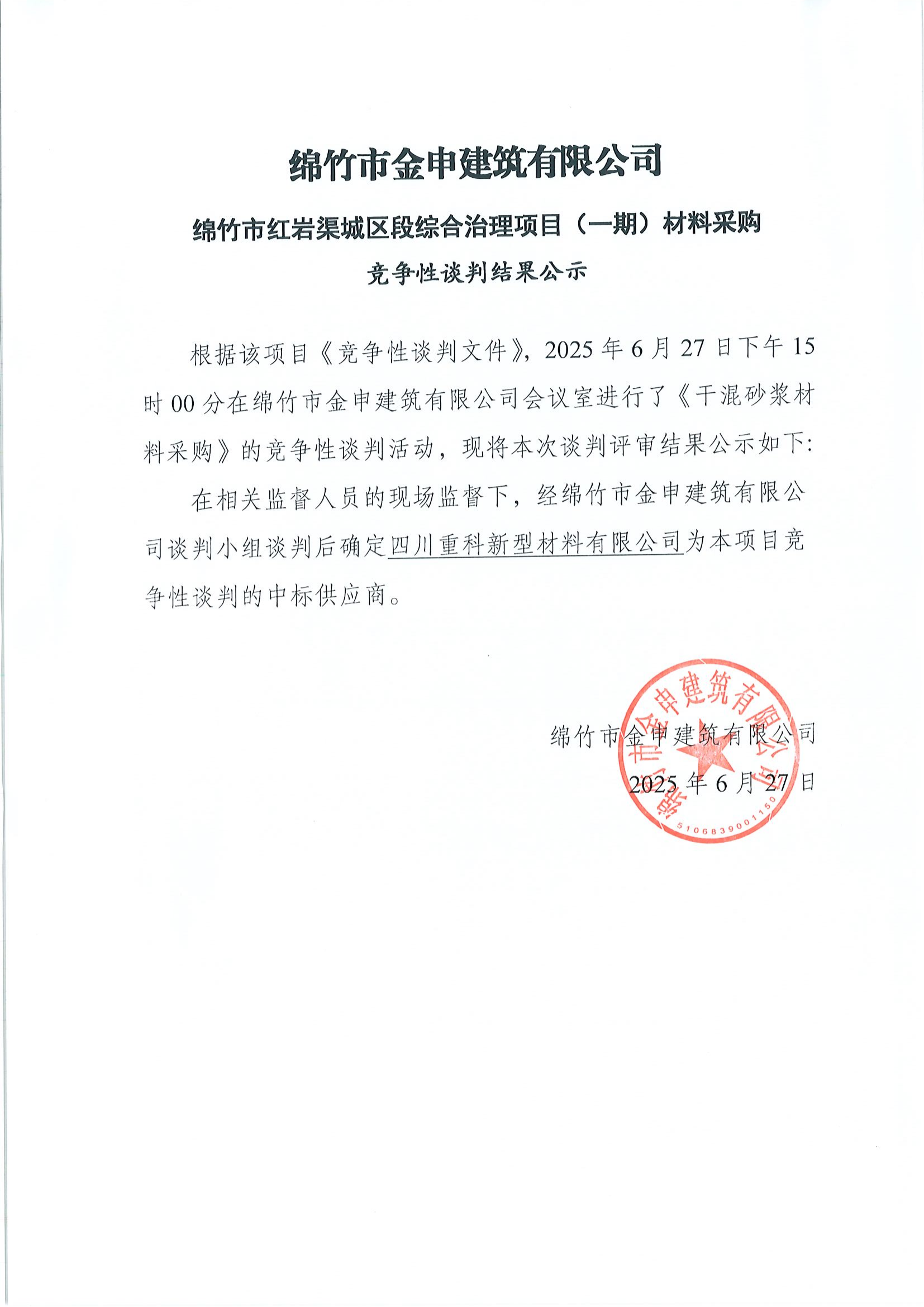 綿竹市紅巖渠項(xiàng)目(干混砂漿)材料采購(gòu)中標(biāo)結(jié)果公示