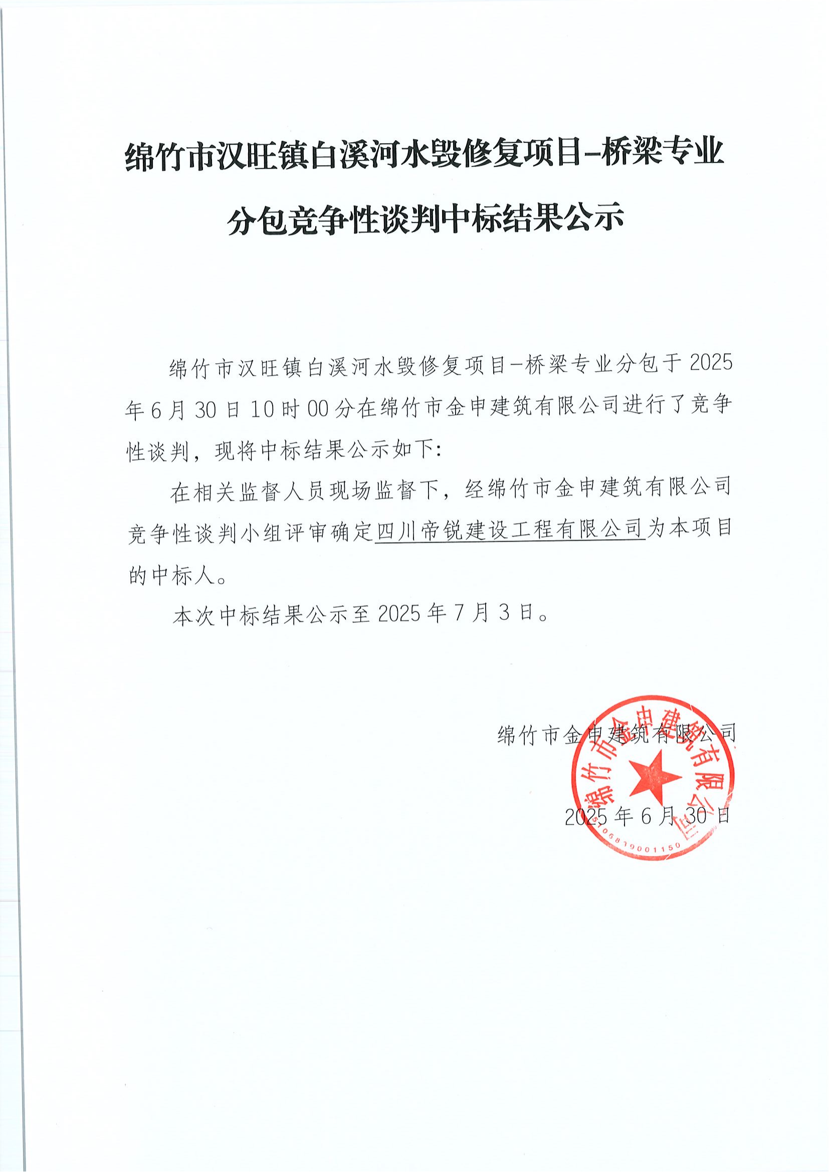 白溪河水毀修復(fù)項(xiàng)目-橋梁專業(yè)分包競爭性談判中標(biāo)結(jié)果公示