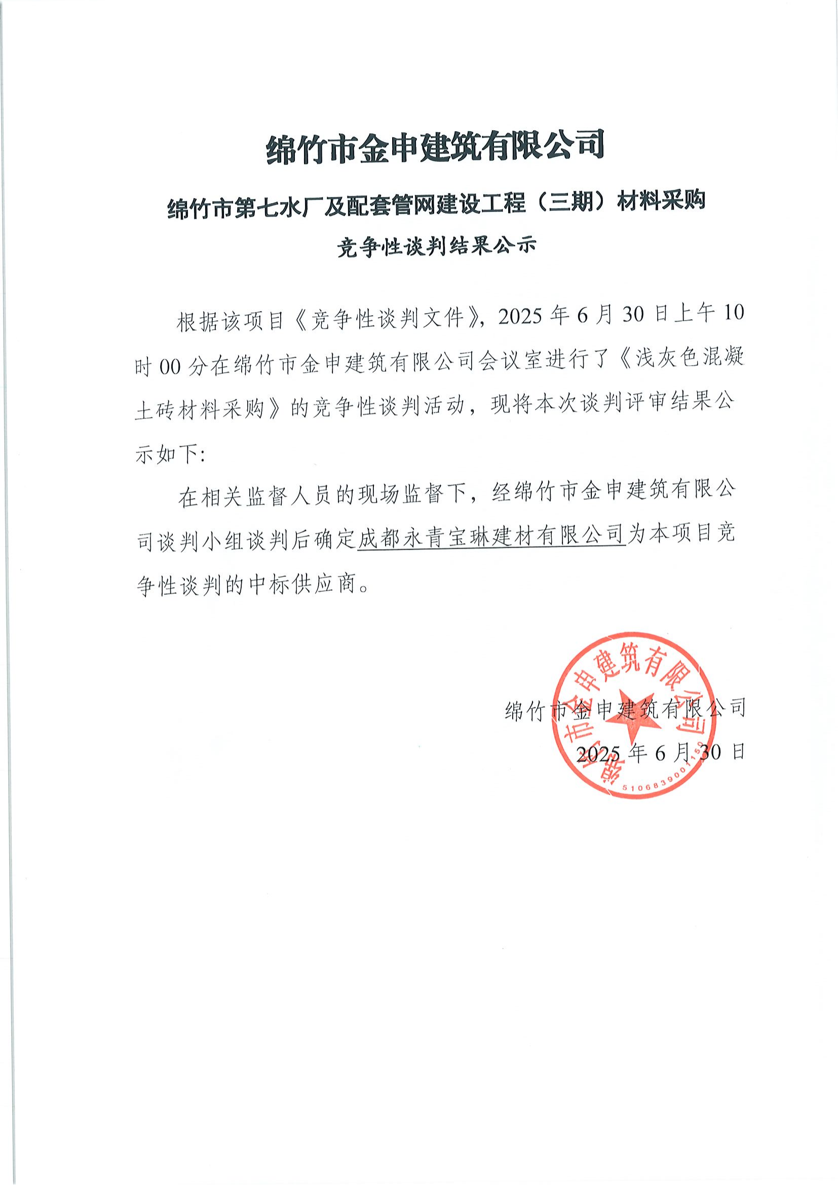 七水廠及配套管網(wǎng)建設(shè)工程(三期)材料中標(biāo)結(jié)果公示