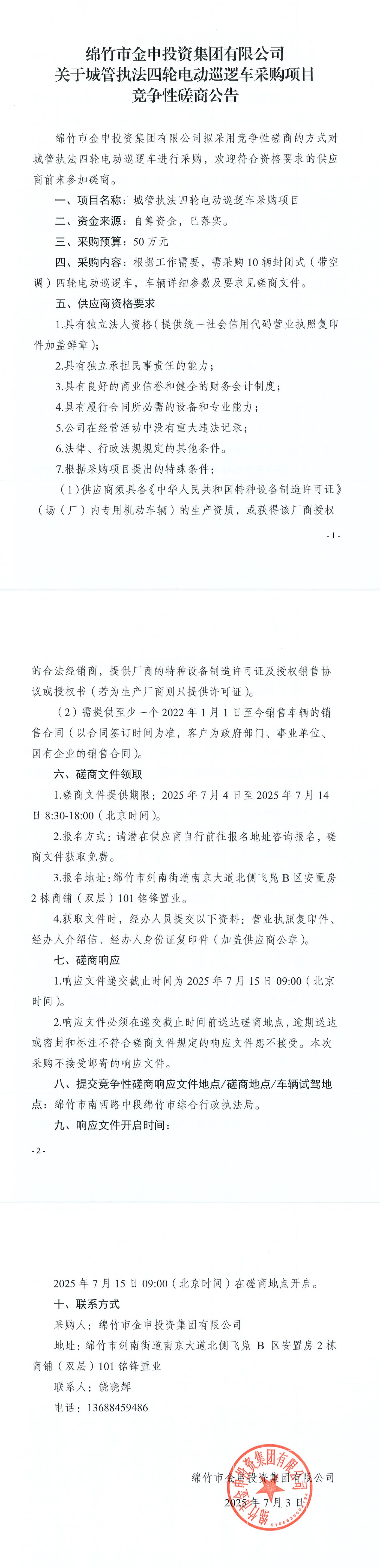 關(guān)于城管執(zhí)法四輪電動巡邏車采購項目競爭性磋商公告