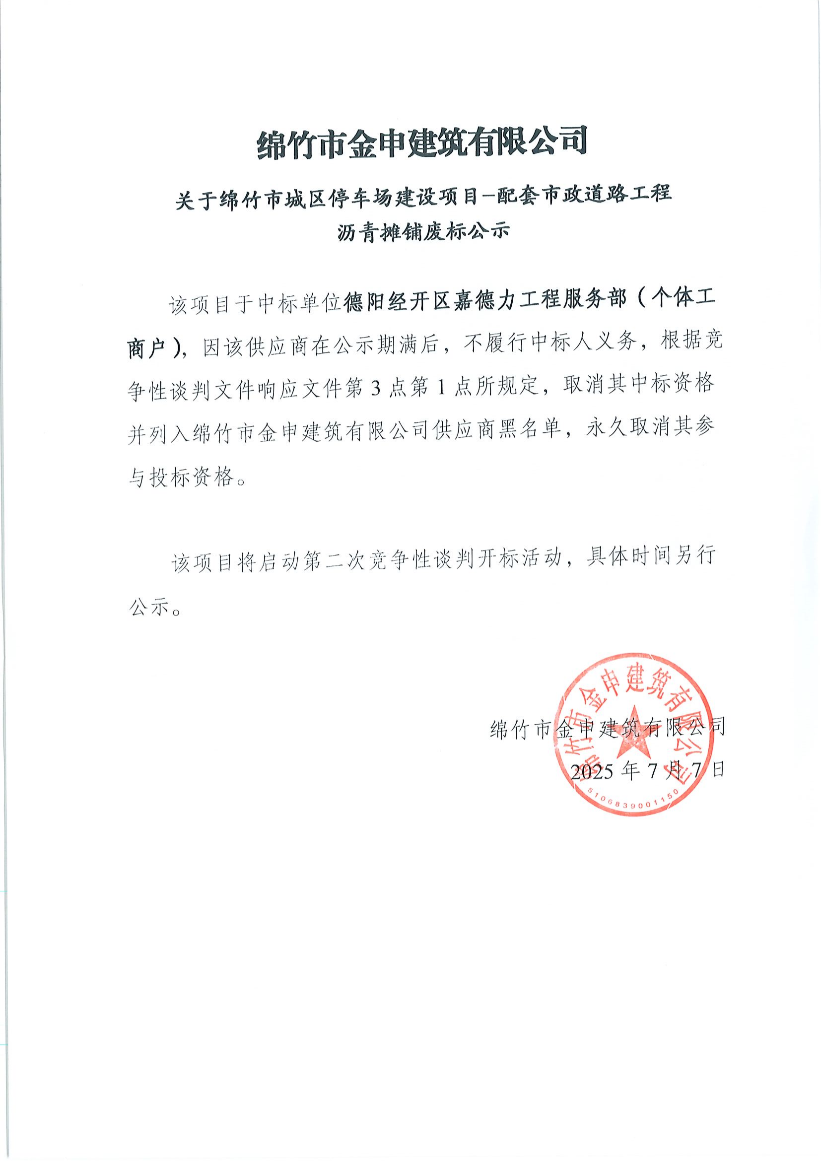 城區(qū)停車場(chǎng)建設(shè)項(xiàng)目(瀝青攤鋪)廢標(biāo)公示