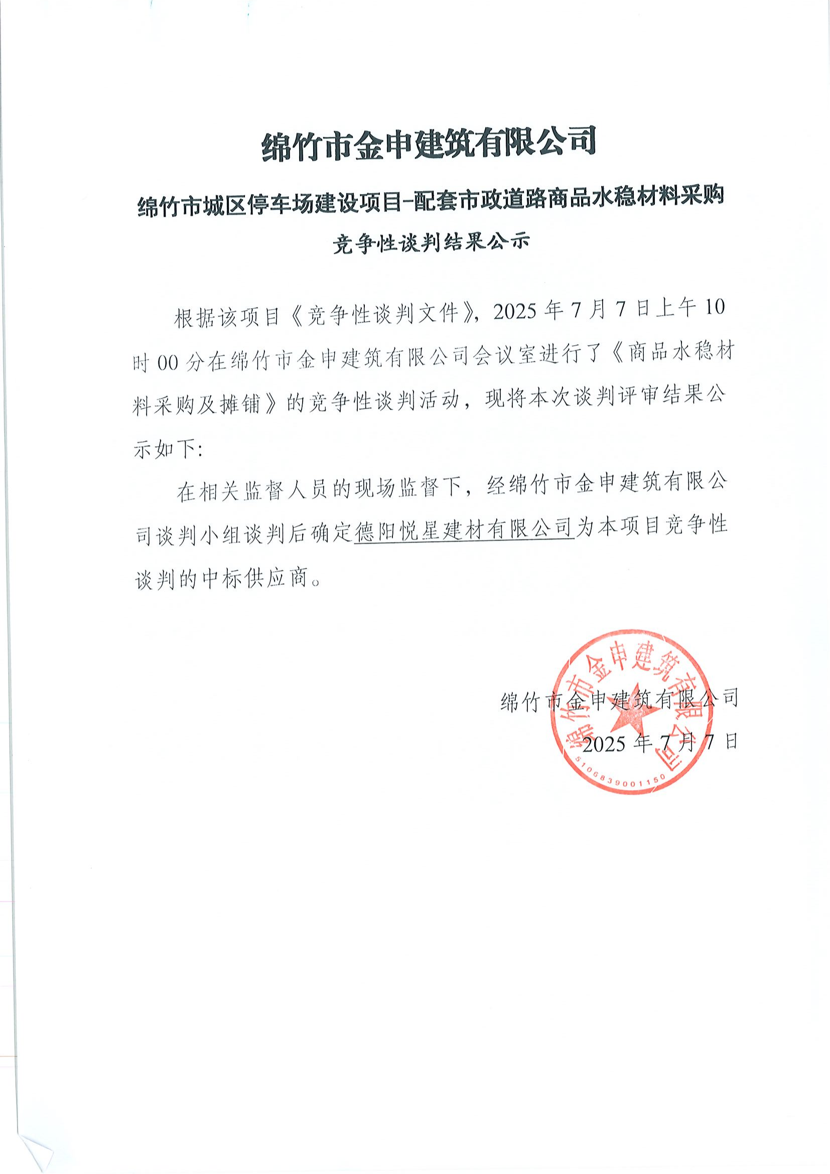 城區(qū)停車場建設(shè)項(xiàng)目(商品水穩(wěn))競爭性談判結(jié)果公示