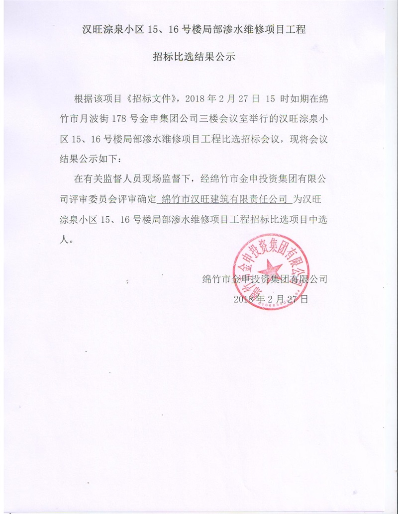 漢旺淙泉小區(qū)15、16號樓局部滲水維修項目招標(biāo)比選結(jié)果公示