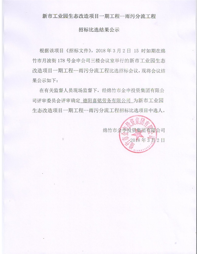 新市工業(yè)園生態(tài)改造項目一期雨污分流工程招標(biāo)結(jié)果公示