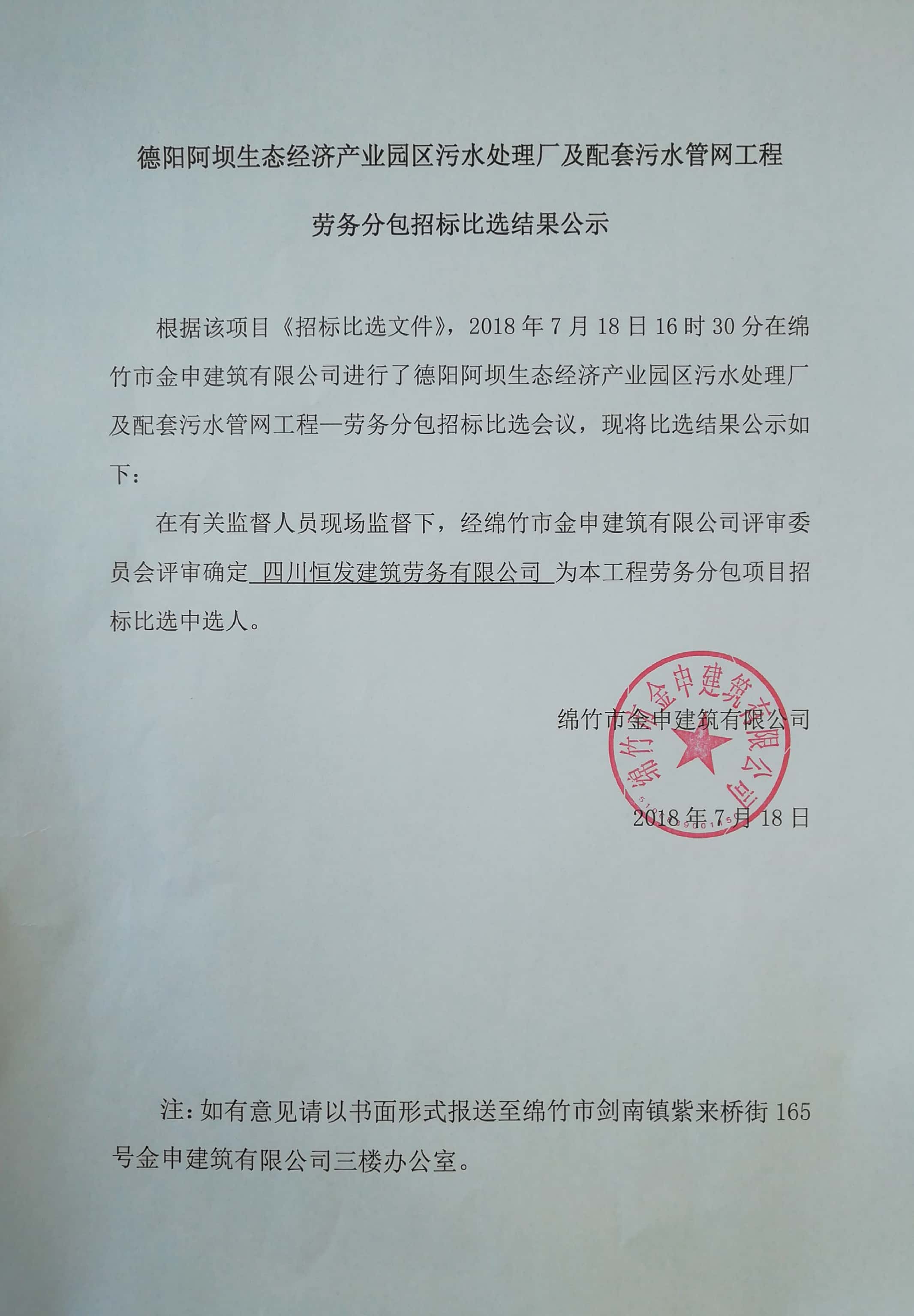 德阿污水處理廠及配套污水管網(wǎng)工程勞務(wù)分包比選結(jié)果公示