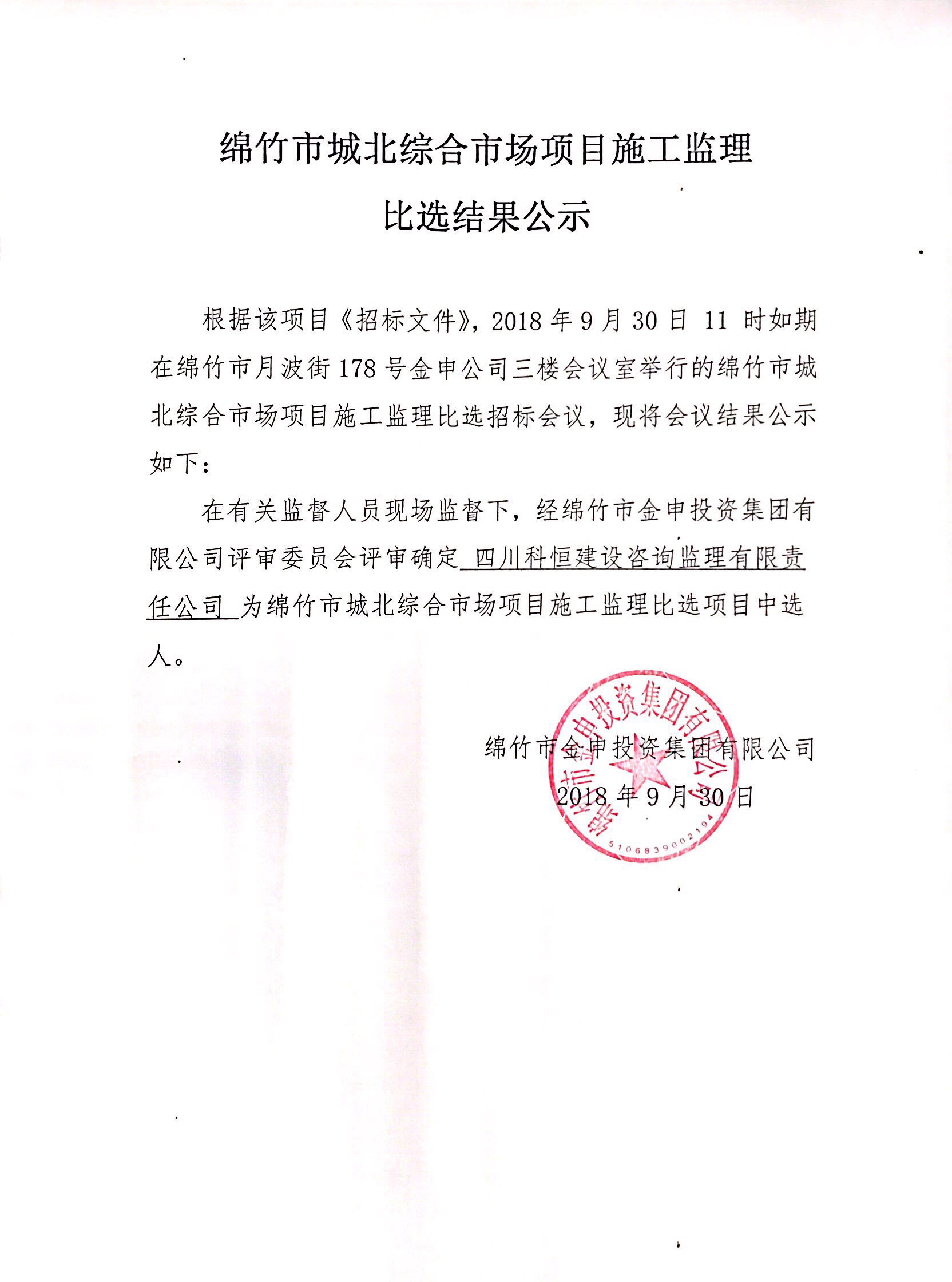 城北綜合市場項目施工監(jiān)理比選結(jié)果公示