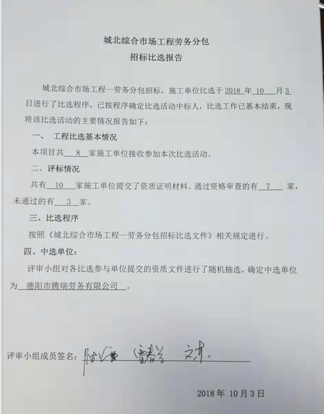 城北綜合市場工程勞務(wù)分包招標(biāo)比選報(bào)告