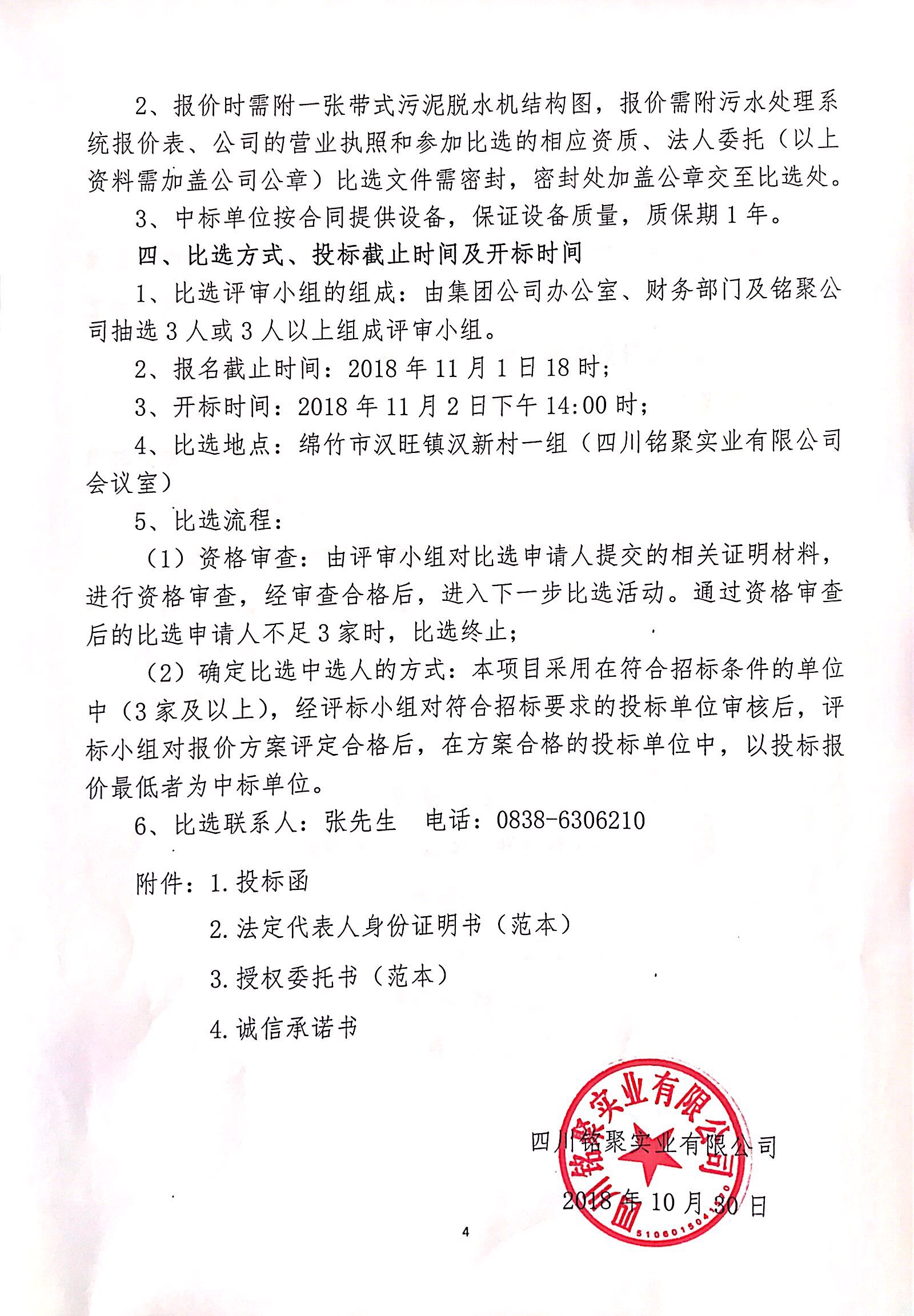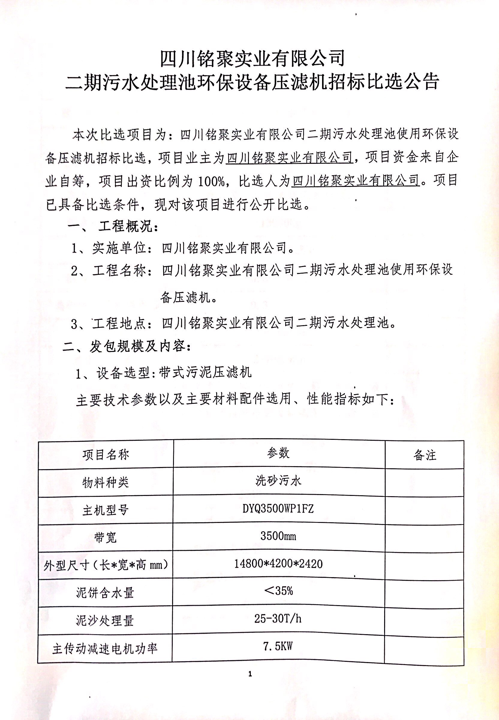 銘聚公司二期污水處理池壓濾機(jī)招標(biāo)比選公告(第二次)