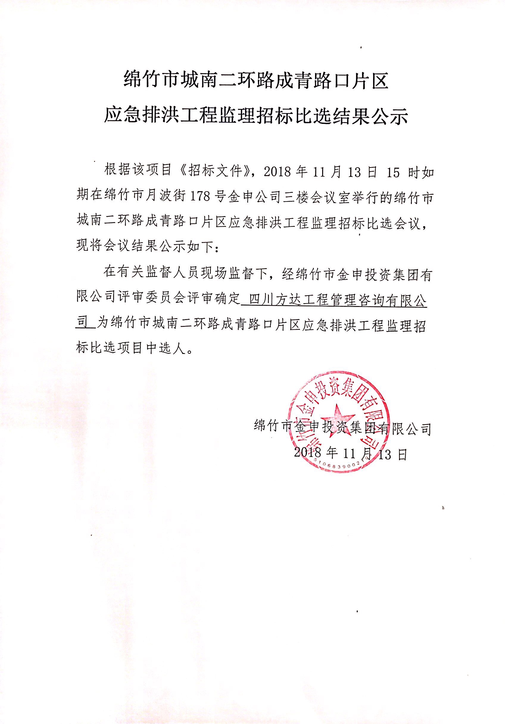 市成青路口片區(qū)應(yīng)急排洪工程監(jiān)理招標比選結(jié)果公示