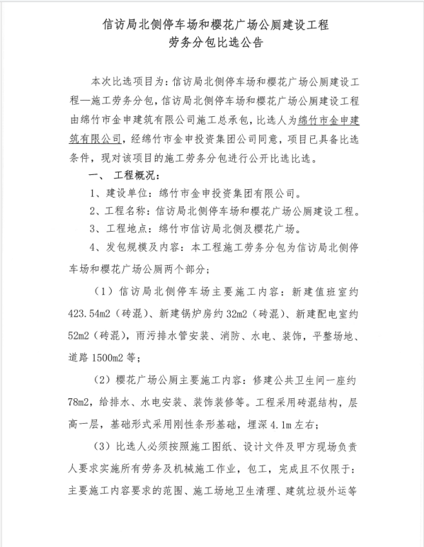 信訪局北側(cè)停車場和櫻花廣場公廁工程勞務(wù)分包比選公告