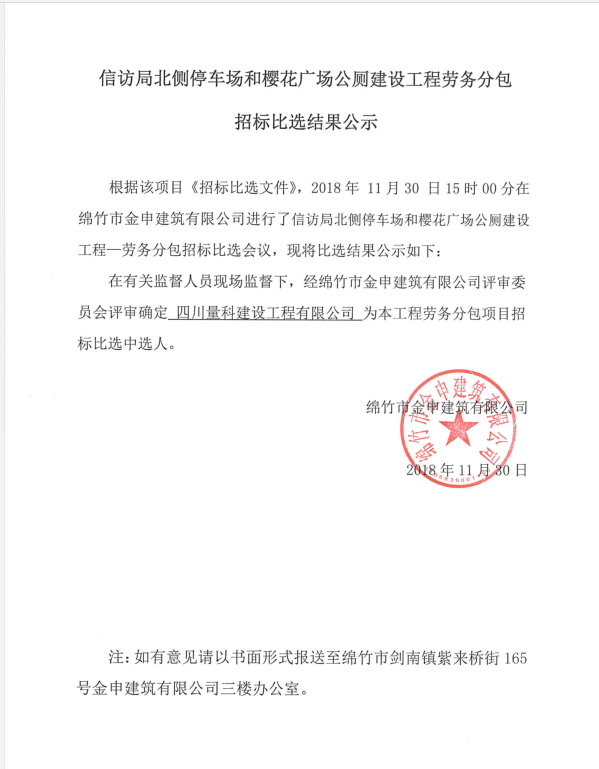 信訪局北側(cè)停車場、櫻花廣場公廁勞務(wù)分包比選結(jié)果公示