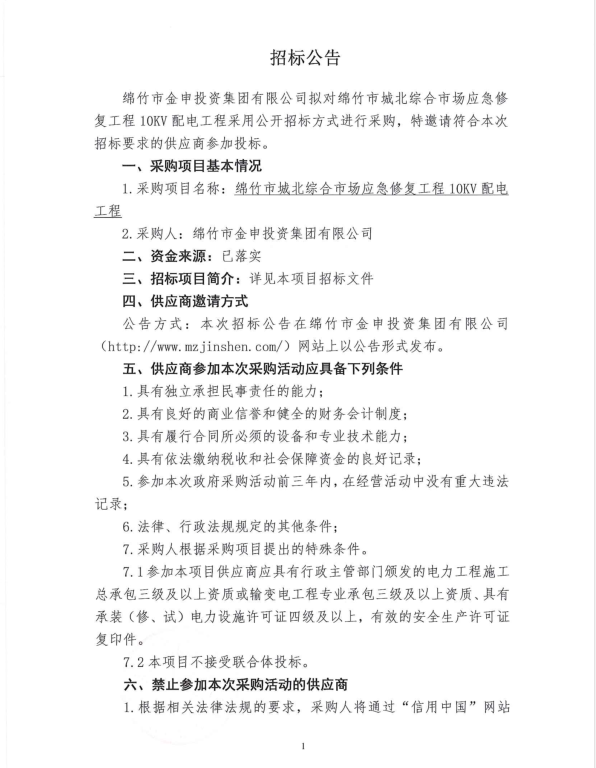 市城北綜合市場應(yīng)急修復(fù)工程10KV配電招標公告