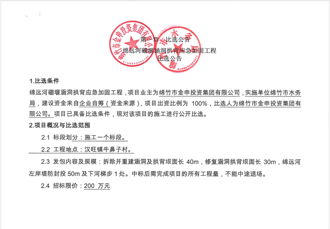 綿遠河硼堰涵洞拱背應(yīng)急加固工程比選公告