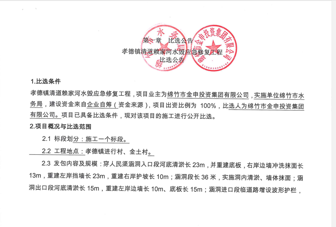 孝德鎮(zhèn)清道賴家河水毀應(yīng)急修復(fù)工程比選公告