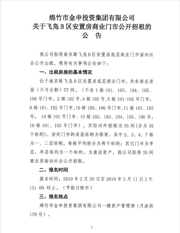 飛鳧B區(qū)安置房商業(yè)門(mén)市第三次公開(kāi)招租公告