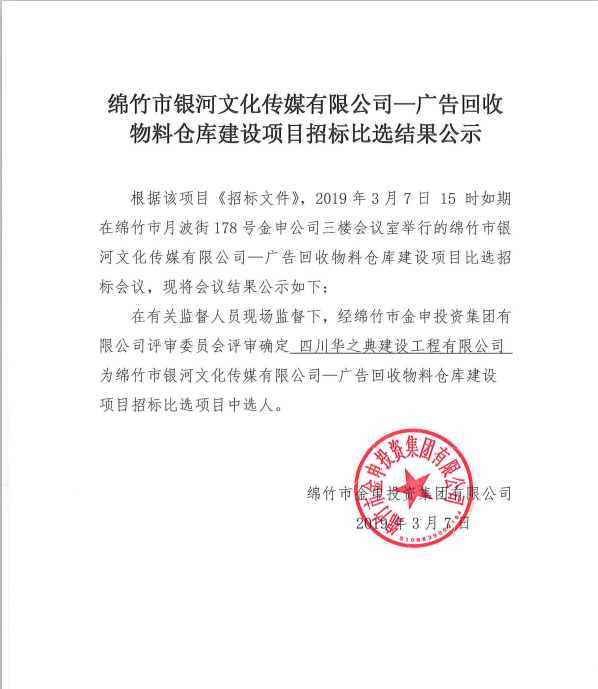 銀河傳媒廣告回收物料倉(cāng)庫(kù)建設(shè)項(xiàng)目招標(biāo)比選結(jié)果公示