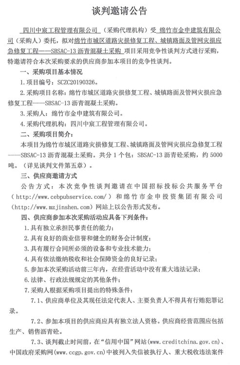 關(guān)于綿竹城區(qū)災(zāi)損修復工程瀝青混泥土采購的談判邀請公告