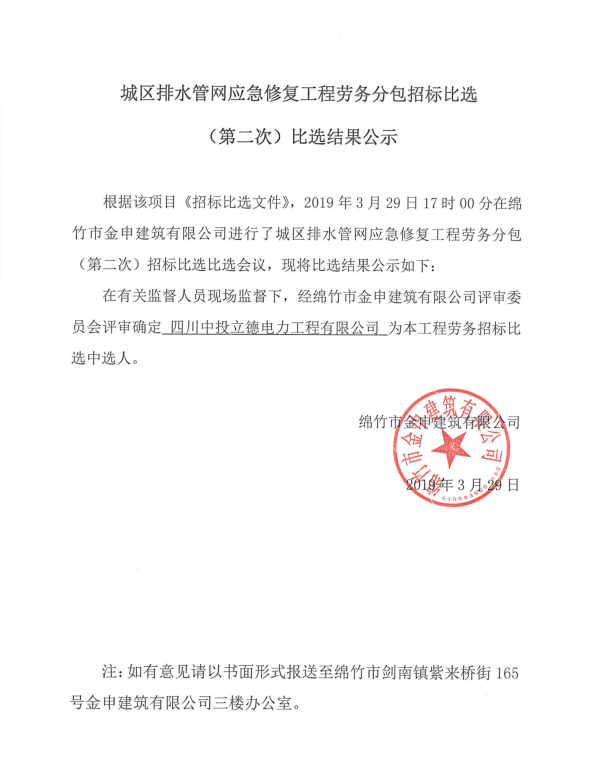 城區(qū)排水管網(wǎng)工程勞務(wù)分包(第二次) 比選結(jié)果公示