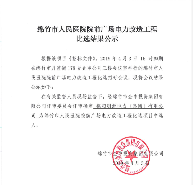 綿竹市人民醫(yī)院院前廣場電力改造工程比選結(jié)果公示