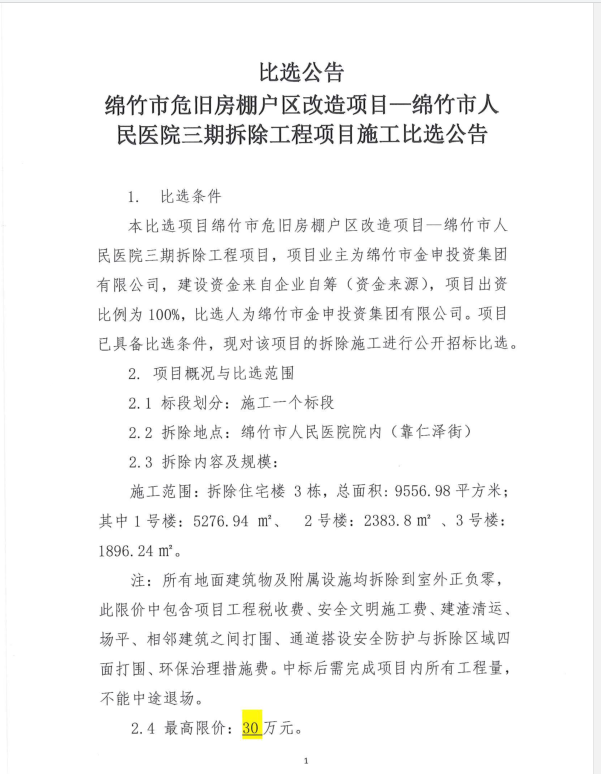市人民醫(yī)院三期拆除工程項(xiàng)目施工比選公告