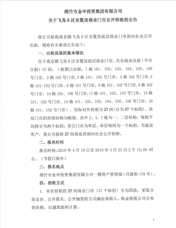 飛鳧B區(qū)安置房商業(yè)門市第四次公開招租公告