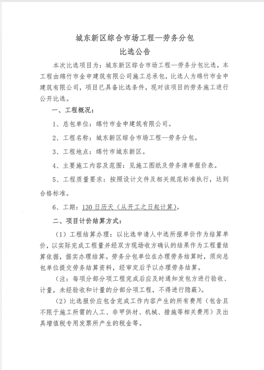 城東新區(qū)綜合市場工程——勞務分包比選公告