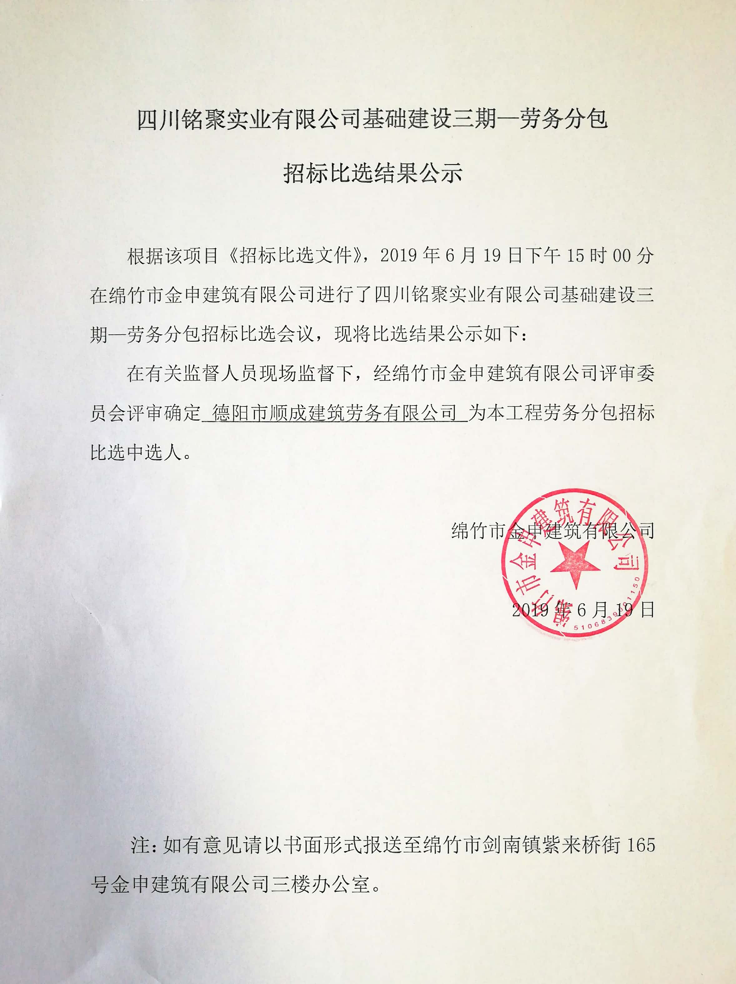 銘聚公司基礎(chǔ)建設(shè)三期—?jiǎng)趧?wù)分包招標(biāo)比選結(jié)果公示