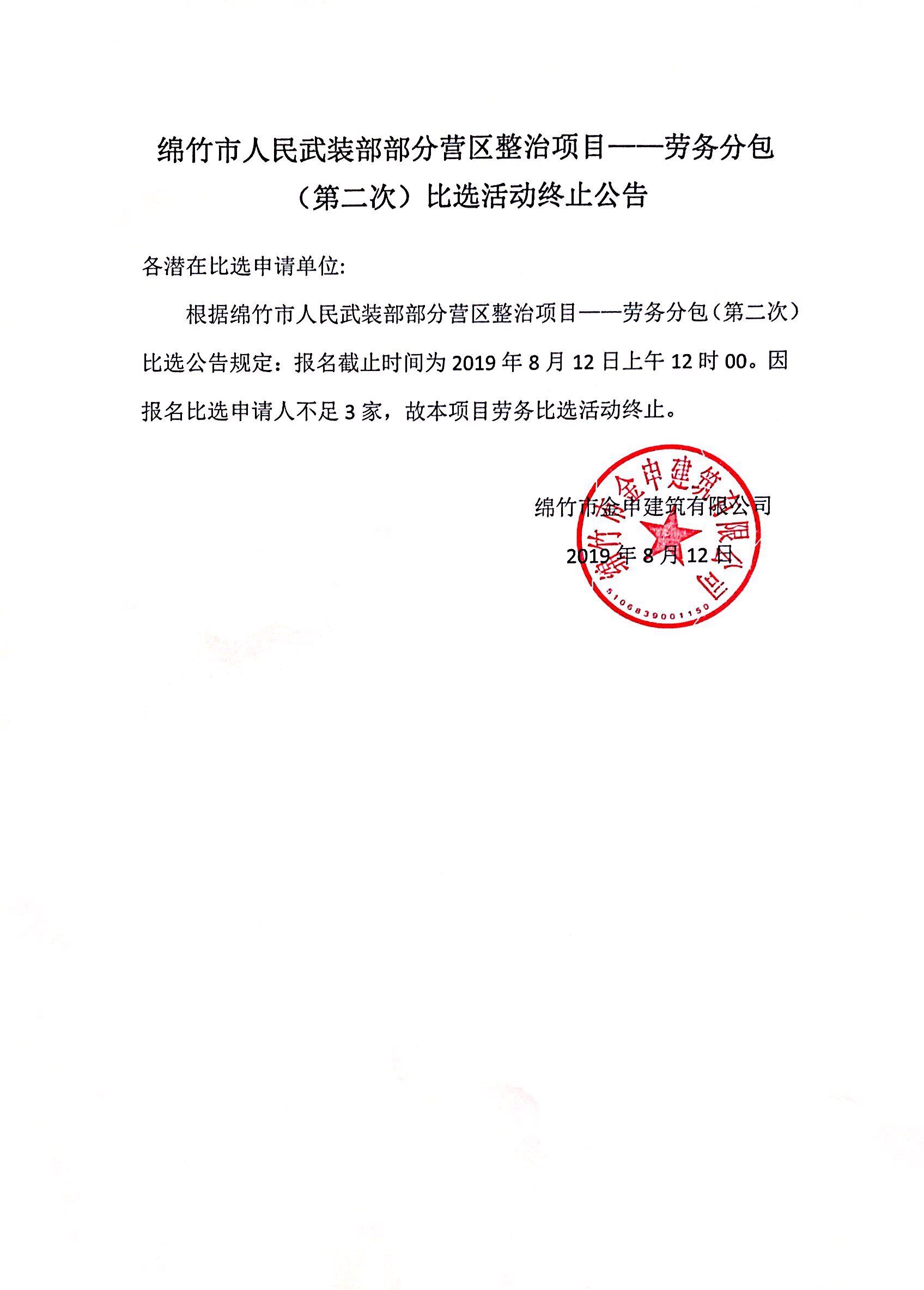 市武裝部整治項(xiàng)目—?jiǎng)趧?wù)分包(第二次)比選活動(dòng)終止公告