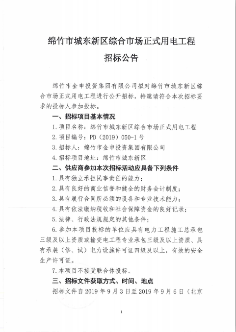 綿竹市城東新區(qū)綜合市場(chǎng)正式用電工程招標(biāo)公告