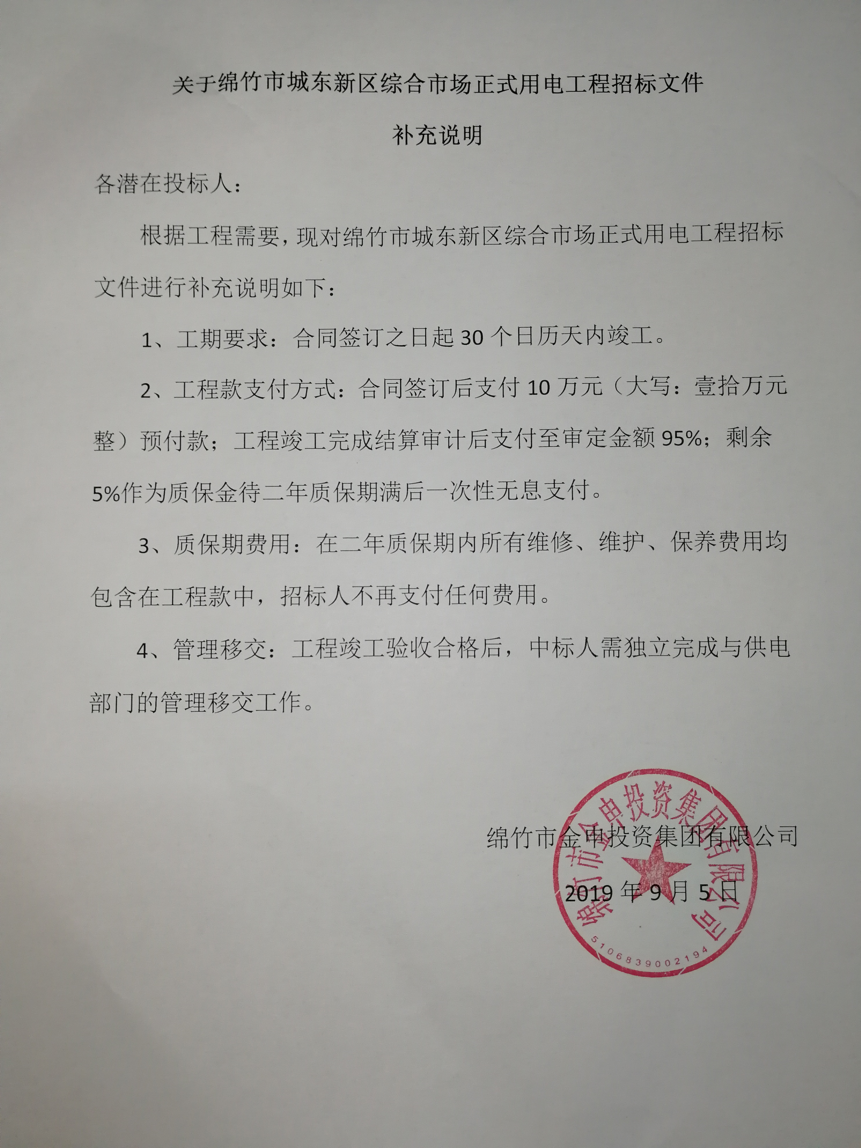 市城東新區(qū)綜合市場(chǎng)正式用電工程招標(biāo)文件補(bǔ)充說明