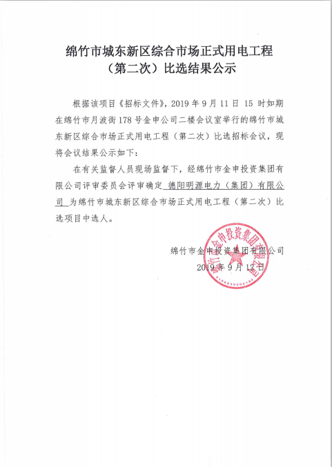 市城東新區(qū)綜合市場正式用電工程(第二次)比選結(jié)果公示
