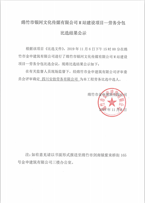 銀河文化傳媒公司M站建設(shè)項目——勞務(wù)分包比選結(jié)果公示