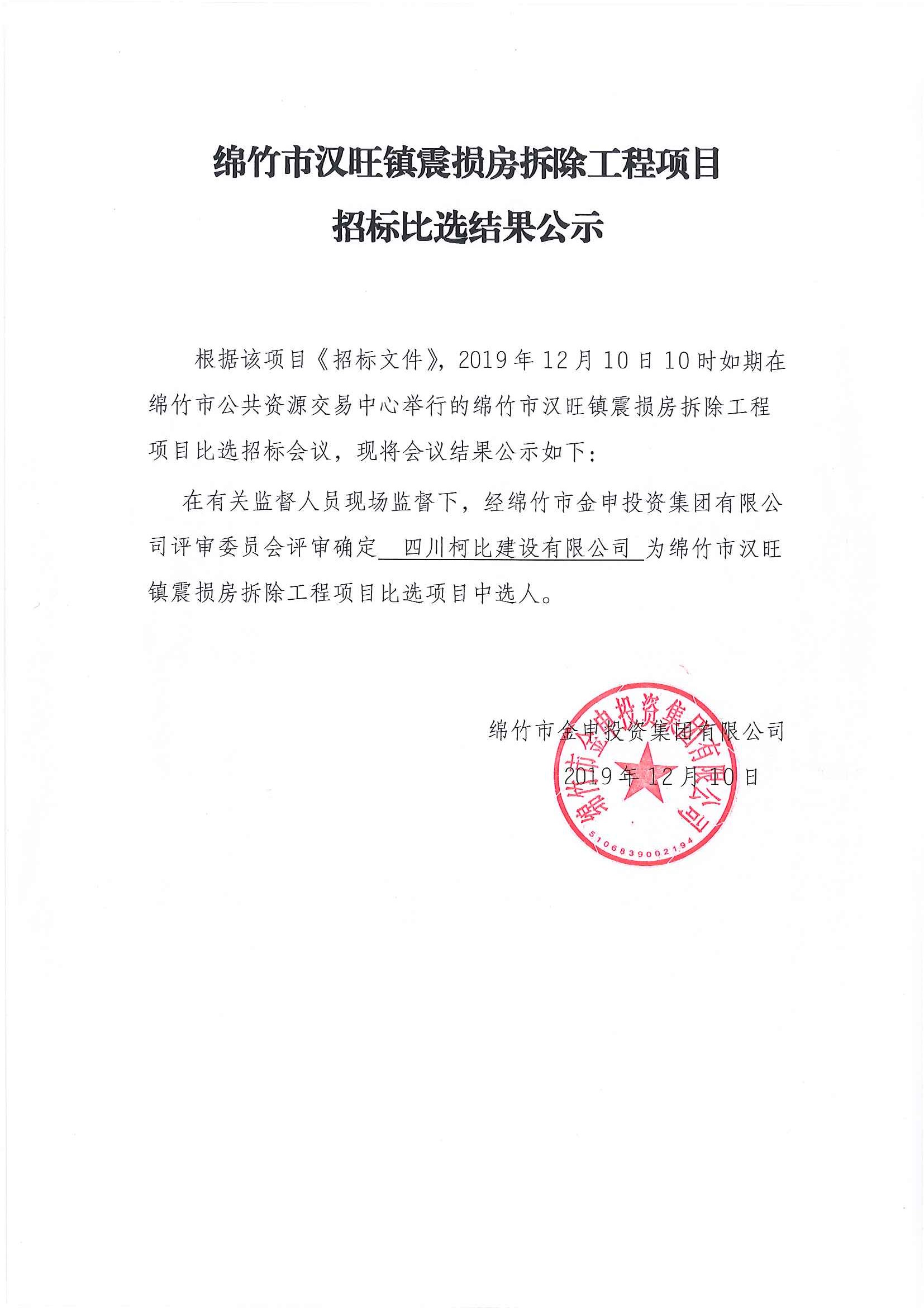 綿竹市漢旺鎮(zhèn)震損房拆除工程項目招標(biāo)比選結(jié)果公示