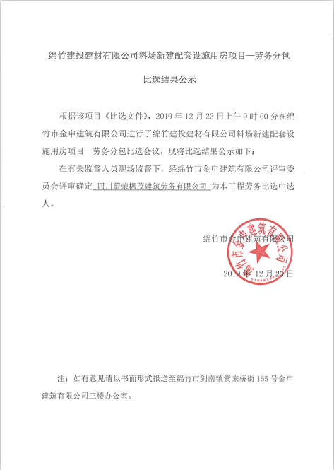 建投建材料場新建配套設(shè)施用房項目勞務(wù)分包比選結(jié)果公示