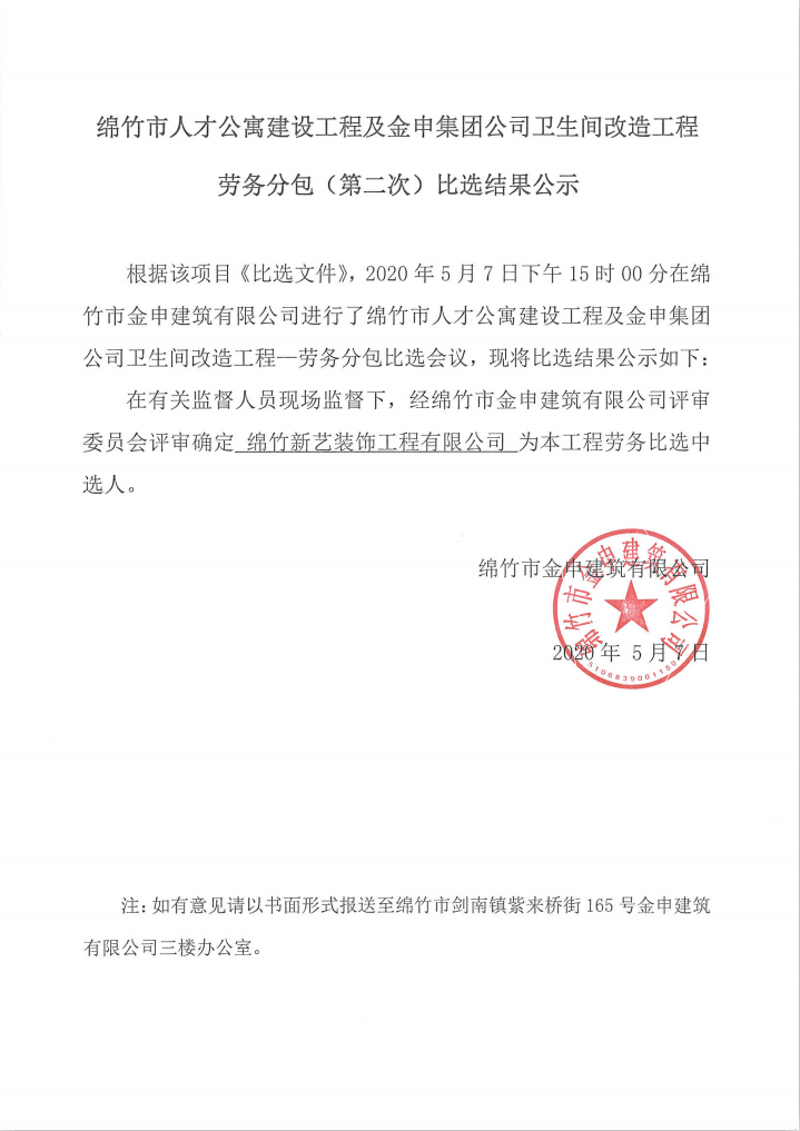 人才公寓金申衛(wèi)生間改造工程勞務(wù)分包(第二次)比選結(jié)果公示