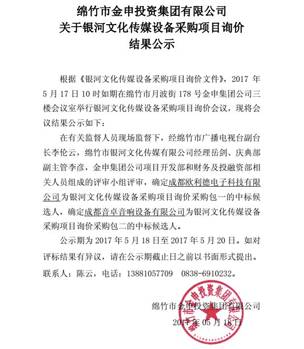 銀河文化傳媒設(shè)備采購項(xiàng)目詢價(jià)結(jié)果公示