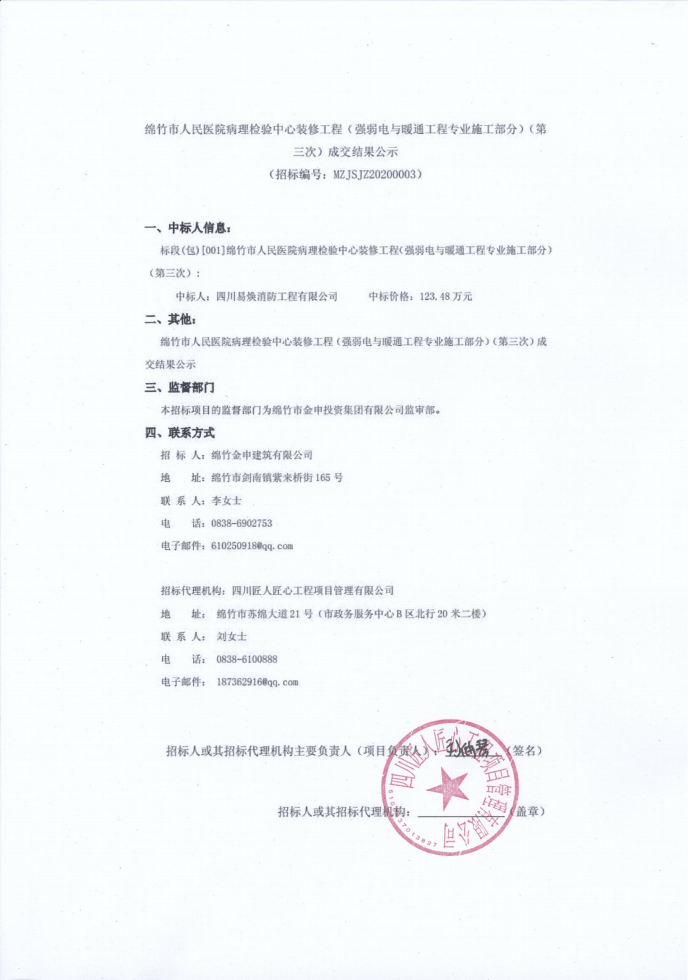 人民醫(yī)院病理檢驗(yàn)中心(強(qiáng)弱電工程)(第三次)成交結(jié)果公示