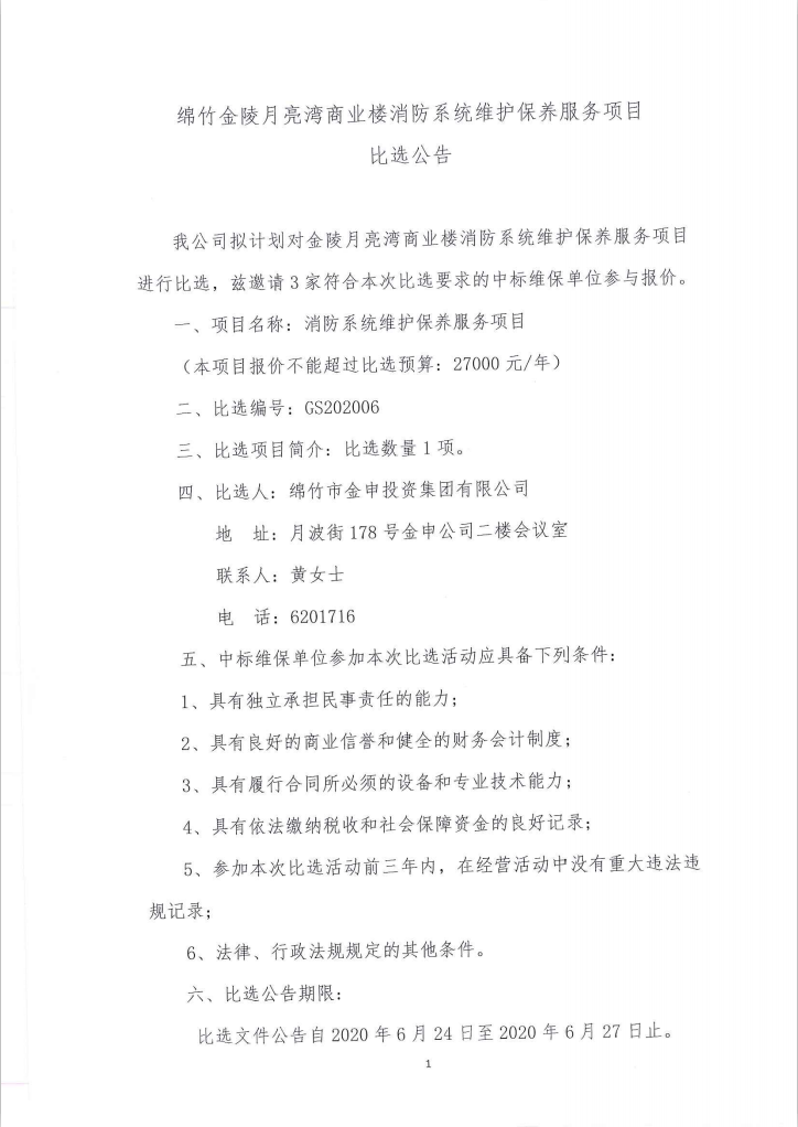 綿竹金陵月亮灣商業(yè)樓消防系統(tǒng)維護(hù)保養(yǎng)服務(wù)項(xiàng)目比選公告