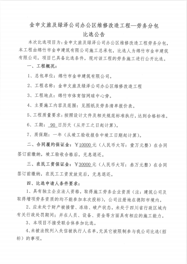 金申文旅及綠澤公司辦公區(qū)改造工程—勞務(wù)分包比選公告