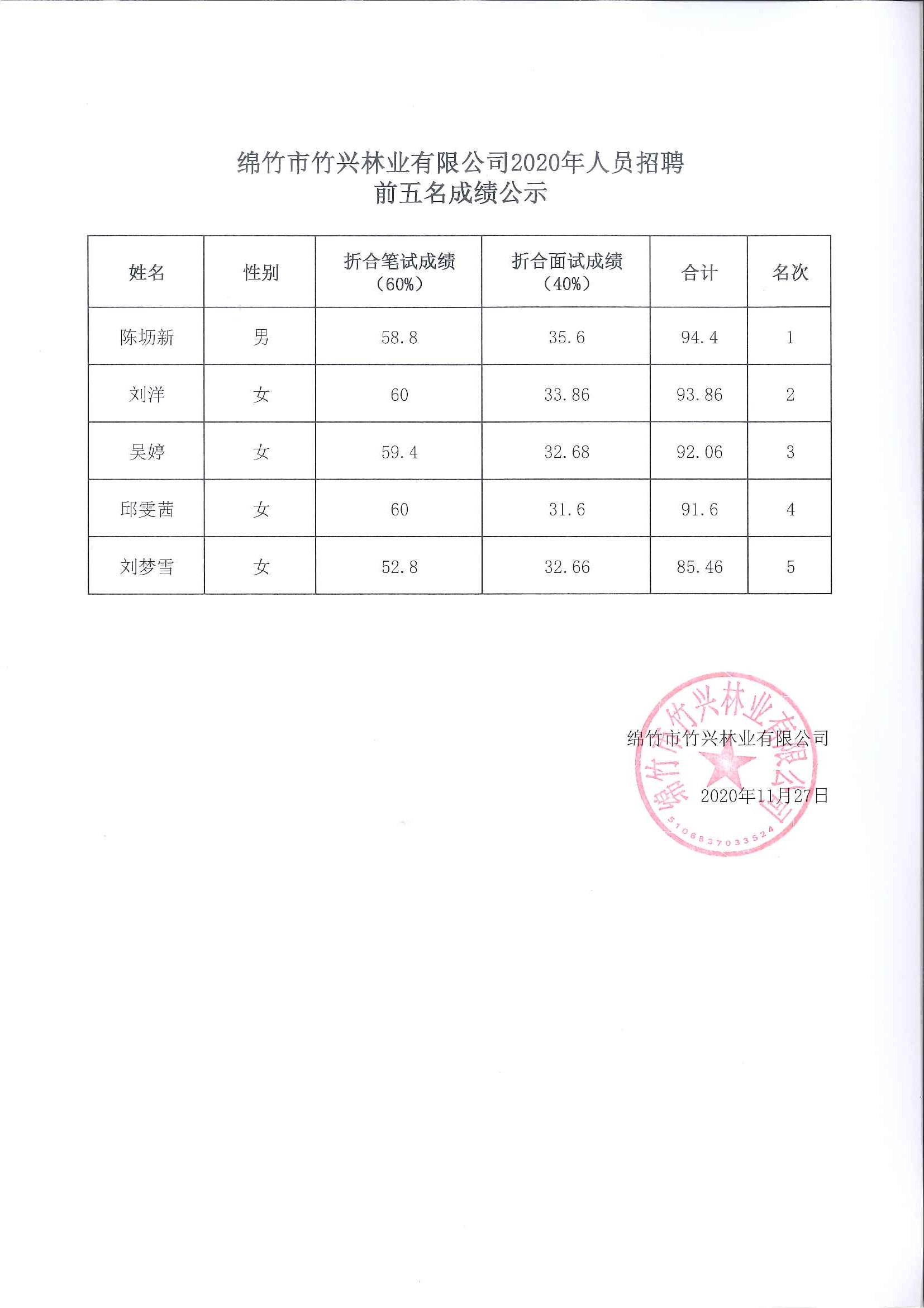 綿竹市竹興林業(yè)有限公司2020年人員招聘前五名成績公示