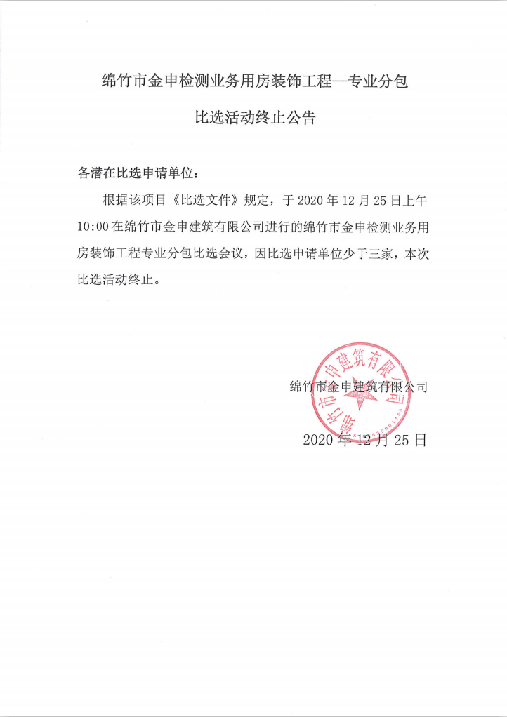 金申檢測(cè)業(yè)務(wù)用房裝飾工程——專業(yè)分包比選活動(dòng)終止公告