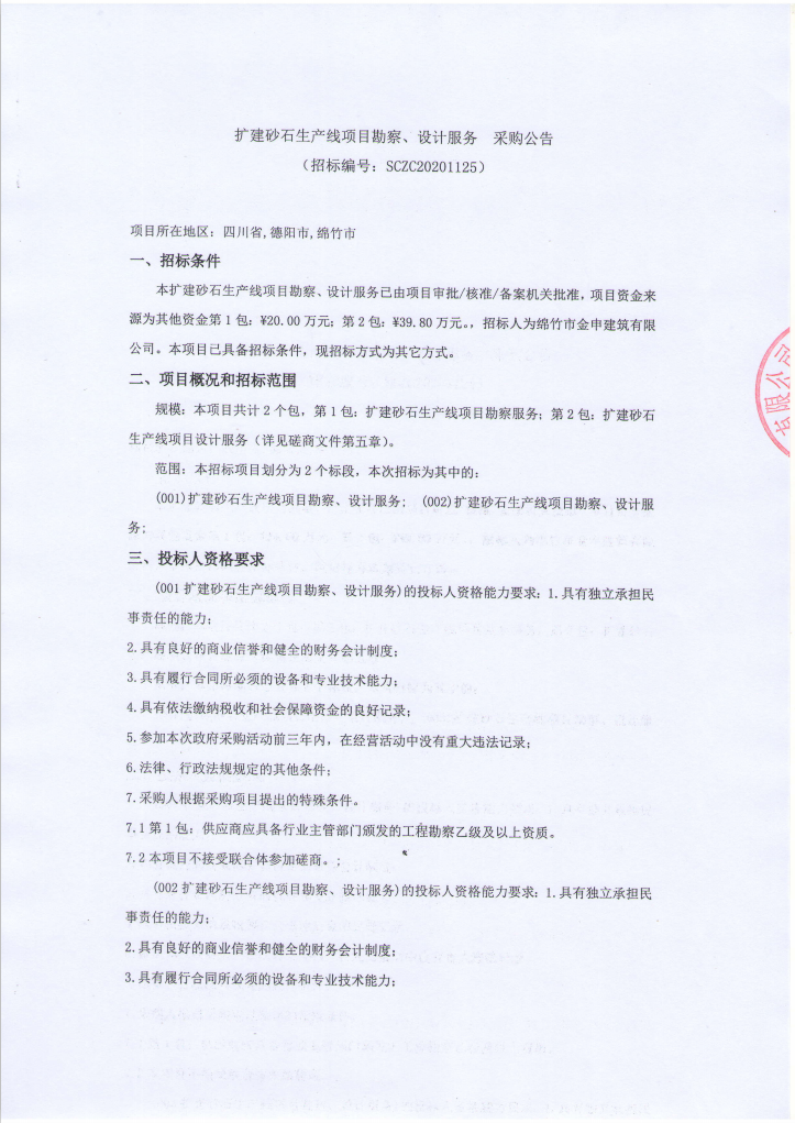 擴(kuò)建砂石生產(chǎn)線項(xiàng)目勘察、設(shè)計(jì)服務(wù)采購(gòu)公告