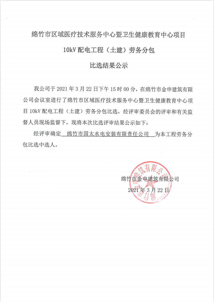 教育中心項(xiàng)目10KV配電工程(土建)勞務(wù)分包比選結(jié)果公告